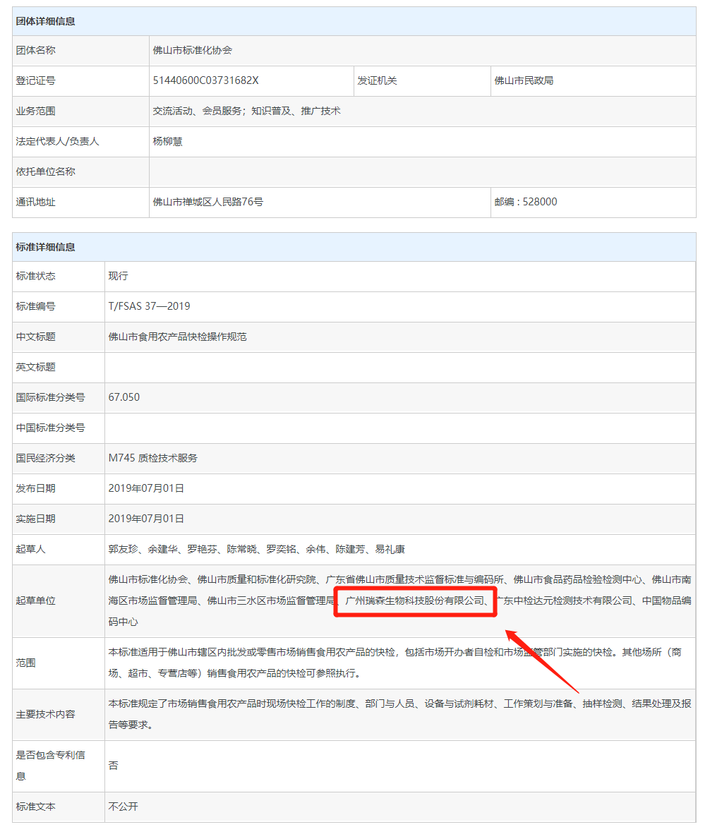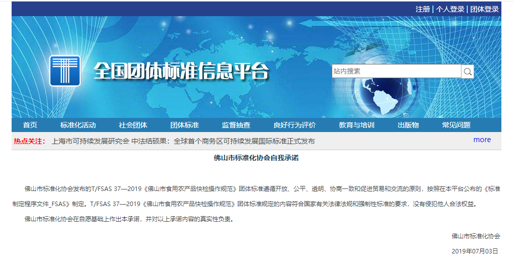 华体会官方端网站登录入口参与制定的T/FSAS 37—2019《佛山市食用农产品快检操作规范》团体标准于2019年7月1日在全国团体标准信息平台发布公示。