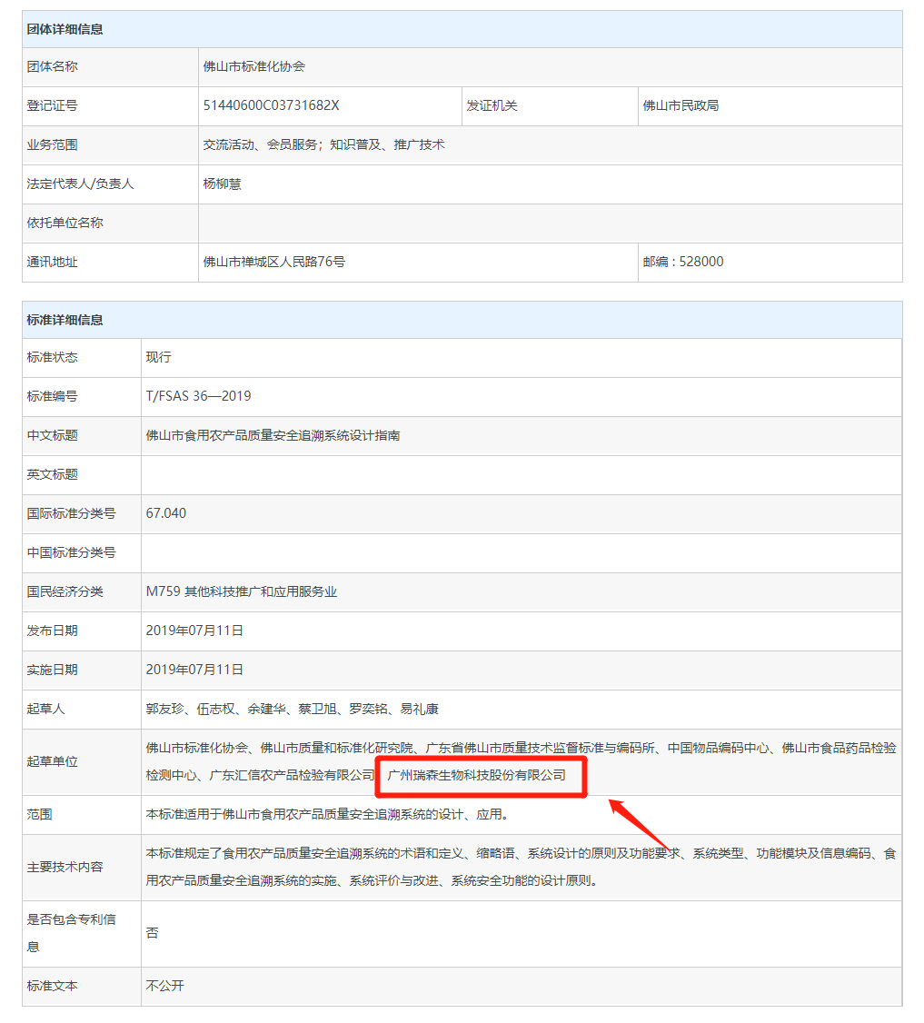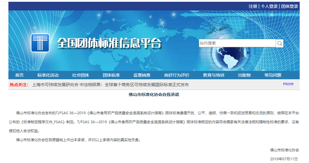 华体会官方端网站登录入口参与制定的T/FSAS 36—2019 《佛山市食用农产品质量安全追溯系统设计指南》团体标准于2019年7月11日在全国团体标准信息平台发布公示。