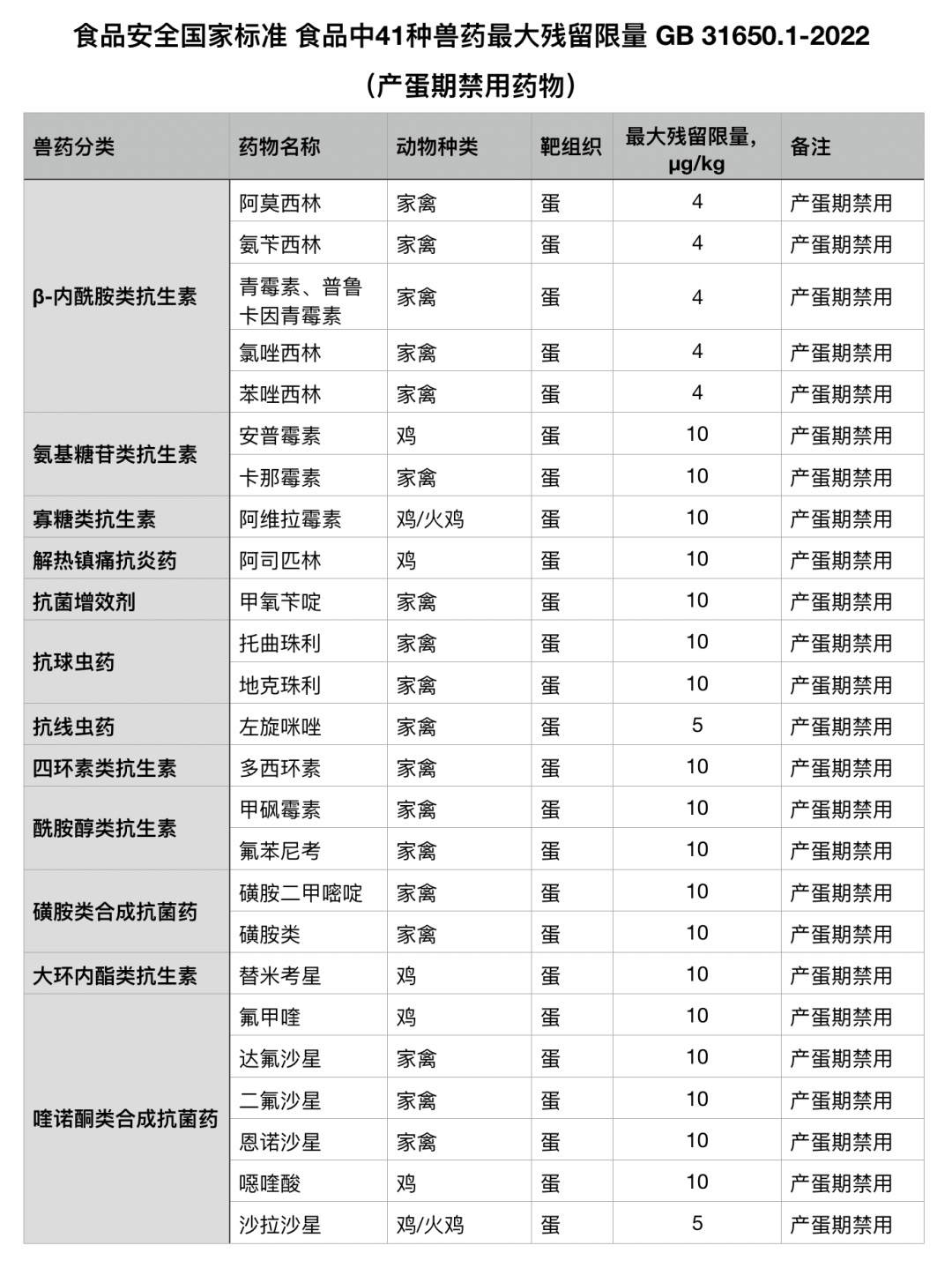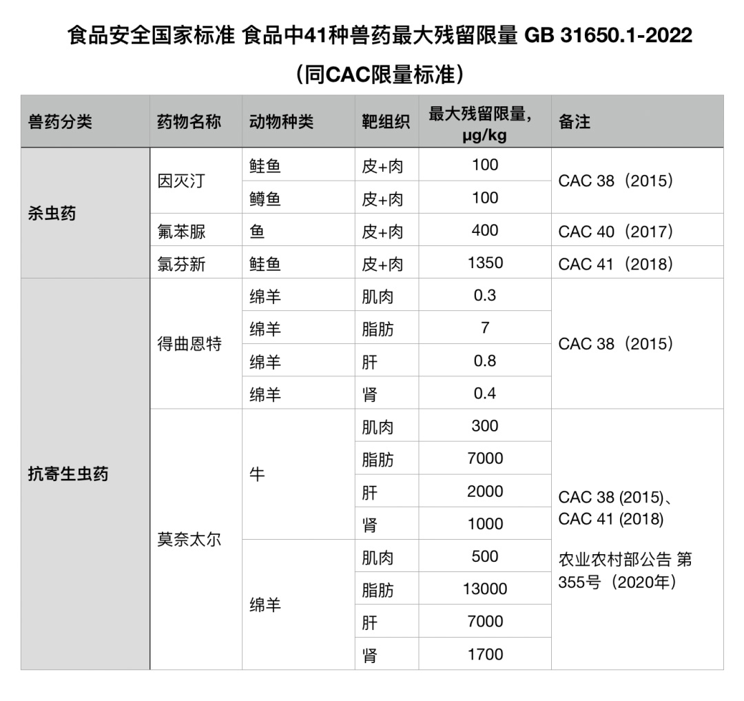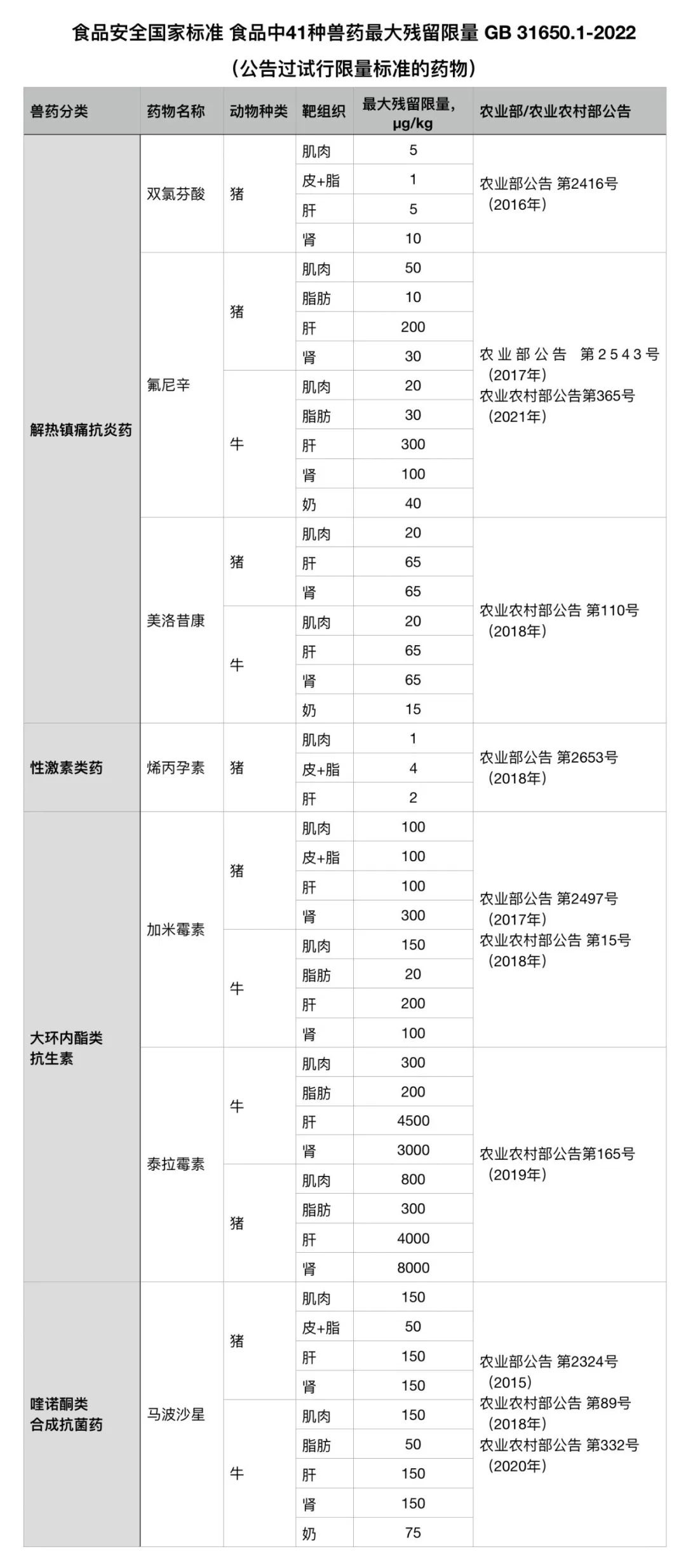 《食品安全国家标准 食品中41种兽药最大残留限量》(GB 31650.1-2022),41种在动物性食品中增修订限量标准的药物,主要为以下四种情况: