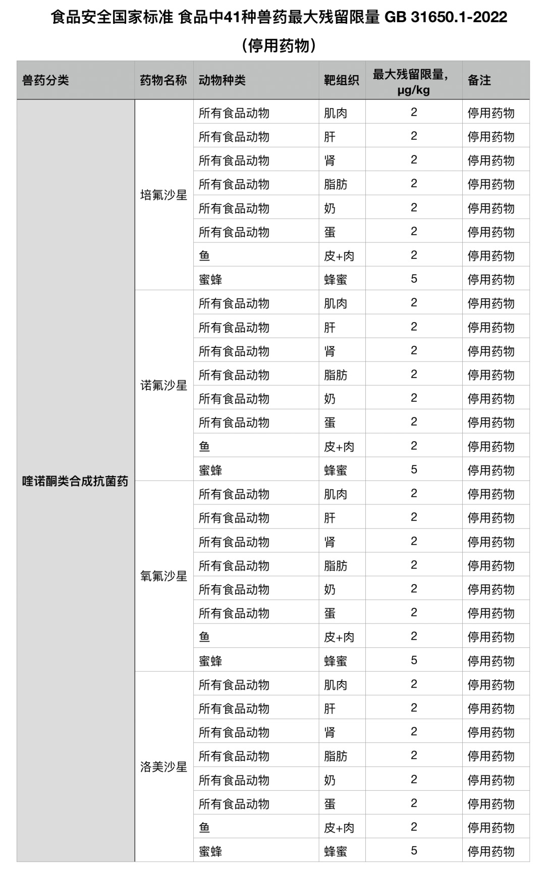 关于靶组织为“蜂蜜”的标准4项,增加停用药物限量(氧氟沙星5μg/kg、诺氟沙星5 μg/kg、培氟沙星5 μg/kg和洛美沙星5 μg/kg)。