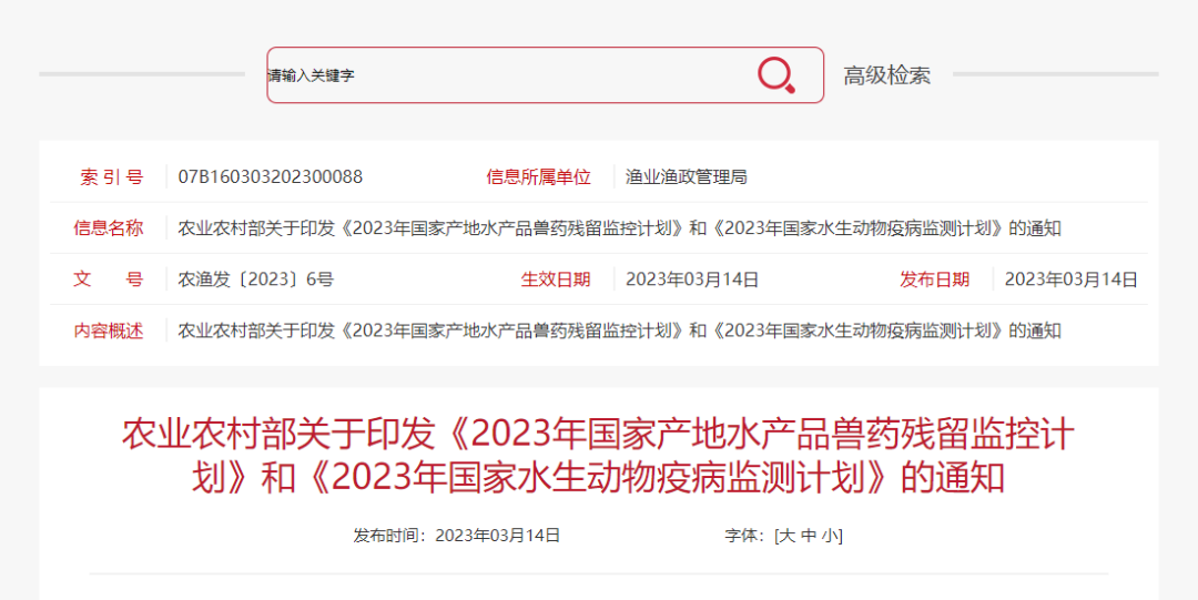 各省、自治区、直辖市农业农村(农牧)、渔业厅(局、委),计划单列市渔业主管局,新疆生产建设兵团农业农村局,各有关单位: 为提升养殖水产品质量安全和生物安全水平,保障水产品安全有效供给,推进水产养殖业绿色高质量发展,根据《中华人民共和国渔业法》、《中华人民共和国农产品质量安全法》、《中华人民共和国动物防疫法》、《兽药管理条例》等法律法规,我部制定了《2023年国家产地水产品兽药残留监控计划》、《2023年国家水生动物疫病监测计划》。现印发给你们,请认真组织实施执行。有关要求通知如下。 (一)农业农村部渔业渔政管理局负责监督管理水产养殖用兽药及其他投入品的使用,负责提出和组织国家产地水产品兽药残留监控计划和国家水生动物疫病监测计划,发布监控(测)结果,组织分析研判养殖水产品的质量安全和养殖水生生物的生物安全形势。 (二)中国水产科学研究院(以下称“水科院”)负责具体组织实施国家产地水产品兽药残留监控计划,对各地监控工作给予技术指导。中国水产科学研究院质量与标准研究中心(以下称“水科院质标中心”)负责国家产地水产品兽药残留监控计划抽检结果的汇总、分析和会商等工作。国家水产品质量监督检验中心等水产品质检机构(以下称“质检机构”)负责协助开展国家产地水产品兽药残留监控计划的抽样、检测和结果报送等工作。 (三)全国水产技术推广总站负责具体组织实施国家水生动物疫病监测计划,组织各省级水生动物疫病预防控制(水产养殖病害防治、水产技术推广)机构(以下称“省级水生动物疫控机构”),协调水生动物疫病参考实验室和相关检测机构,开展全国水生动物疫病监测,指导各省份开展监测、净化与评估工作;组织首席专家开展监测信息的分析评估、疫病形势会商和疫情预警工作;及时完成监测结果汇总、分析和上报;发生突发水生动物疫情时,及时组织开展紧急监测诊断处置工作。负责国家产地水产品兽药残留监控计划中水产养殖动物主要病原菌耐药性监测的具体组织实施工作,负责组织各级水产技术推广机构和相关专家开展水产养殖用药减量行动和规范用药科普下乡活动,及时调度各地工作情况和总结。 (四)省级主管部门负责组织实施本辖区内国家产地水产品兽药残留监控计划和国家水生动物疫病监测计划,加强产地水产品兽药残留管控,做好水生动物疫病防控,制定和组织实施省级产地水产品兽药残留监控(监督抽查)计划和水生动物疫病监测计划,对辖区内各级主管部门开展的产地水产品兽药残留监控和水生动物疫病监测等工作进行指导。 (一)加强组织领导。加强养殖水产品质量安全监管和养殖水生生物疫病防控是保障水产品安全有效供给的基础。地方各级农业农村(渔业)主管部门务必要高度重视这两项工作,强化组织领导,细化职责分工,压实各级责任,加强部门联动,不折不扣地完成国家产地水产品兽药残留监控计划和国家水生动物疫病监测计划的各项工作任务。 (二)强化经费保障。依据《中华人民共和国农产品质量安全法》、《中华人民共和国动物防疫法》等法律,各地农业农村(渔业)部门要将产地水产品兽药残留监控和水生动物疫病监测工作纳入本级财政预算,落实监管责任,确保工作取得实效。国家产地水产品兽药残留监控计划和国家水生动物疫病监测计划中国家负责部分所需经费纳入中央财政预算。 (三)推进源头治理。地方各级农业农村(渔业)主管部门要持续加强水产品质量安全和水生生物生物安全的源头管控,结合水产绿色健康养殖技术推广“五大行动”的实施,推广生态健康养殖技术模式,升级基础设施装备,配套水产良种和防病技术,规范日常管理和兽药使用,持续提升养殖主体的质量安全和疫病防控意识。相关省份要开展海参和牛蛙养殖用药专项整治“回头看”工作,严厉打击养殖生产中违法用药行为。 (四)加强协作配合。地方各级农业农村(渔业)主管部门及执法机构要统筹协调好渔业与兽药、饲料、农药、质量安全等部门的联合监管和执法协作,持续深化食用农产品“治违禁、控药残、促提升”三年行动,合力实施更为严厉的全程监管,规范执法程序,做好行刑衔接,加大对相关违法行为的打击力度,共同提高养殖水产品质量安全水平。 附件:1. 2023年国家产地水产品兽药残留监控计划